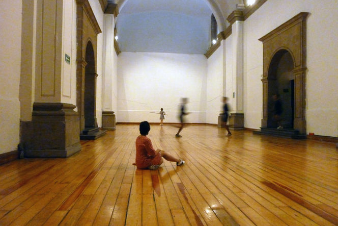 El objetivo de este proyecto fue trabajar con diferentes temporalidades jugando con la relación entre el cuerpo humano y la arquitectura, partiendo de la idea que esta, interactua con las espectativas y comportamientos humanos, moldeando y conduciendo a nuestros cuerpos. Me interesaba exponer al cuerpo, tanto de los performers como de la audiencia, con la arquitectura monumental de la nave central de Laboratorio Arte Alameda, de manera directa sin ningún elemento extra mas que nuestros cuerpos, la voz y el dibujo.